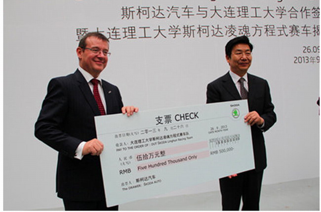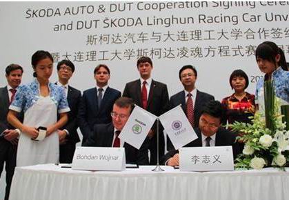 2013年9月26日,斯柯达汽车与我校共同签署了一份为期三年的合作协议,双方将互派优秀学生开展学术交流,支持学院科研项目,并邀请双方骨干专家教授为学生授课,携手培养高级汽车人才。斯柯达汽车还将赞助“凌魂车队”出征于10月15日-19日在湖北襄樊举行的2013中国大学生方程式汽车大赛。活动当天,斯柯达汽车全球人力资源董事Bohdan Wojnar先生和副校长李志义教授代表合作方在协议上签字,并共同为大连理工大学斯柯达“凌魂车队”最新的参赛用车揭幕。