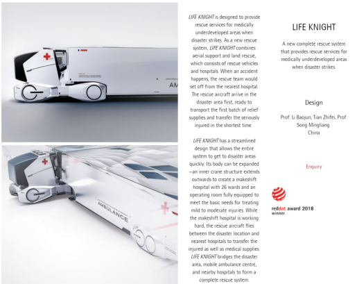 018年9月28日,汽车学院房车技术研究中心的李宝军副教授、宋明亮老师等所设计的“LIFE KNIGHT移动医疗救护中心”项目荣获2018国际红点概念设计奖,李宝军作为嘉宾参加了在新加坡举行的颁奖典礼。这次获奖是该研究中心进行跨学科合作的首个设计国际大奖。